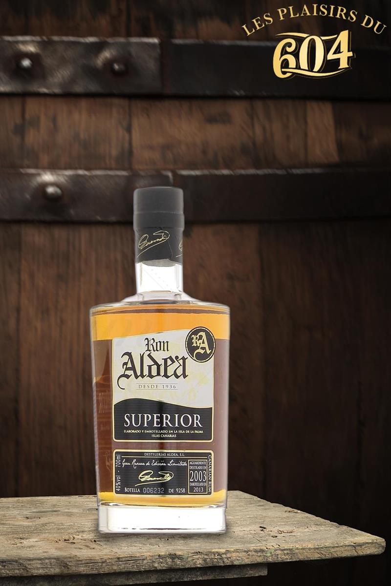 Aldea Superior is a pure cane juice rum, distilled in 2003 on the family estate in the Canary Islands and aged for 10 years in American white oak barrels. It was bottled in 2013.